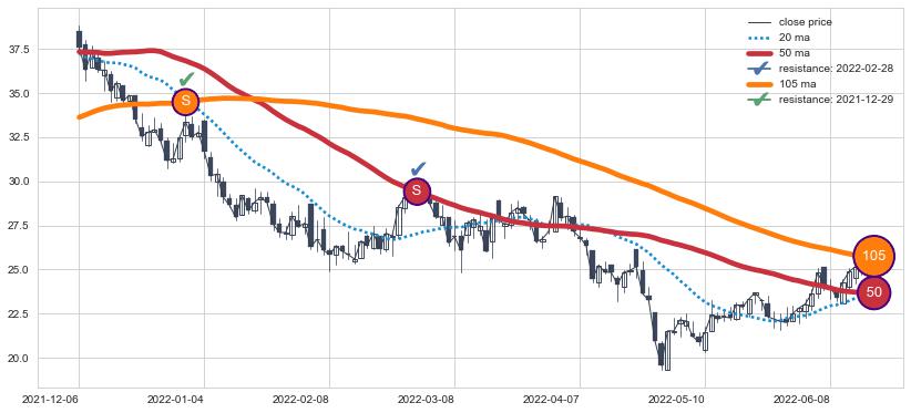 ⚂ 2022-07-21日突然冒出一根大阴线,一下子下穿三条均线且收盘价收在各条均线之下
