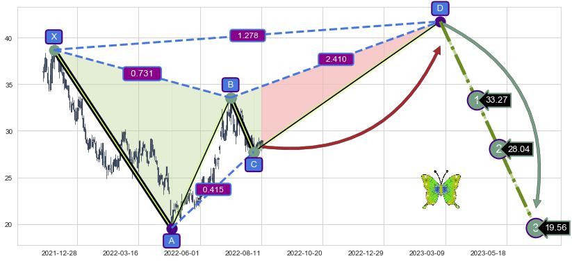 ➣ 未完成【蝴蝶】形态起点X: 2021-12-01, 已到达C点: 2022-08-03, 预测最终D点: 2023-03-03, 共315交易日