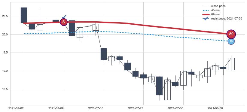⚂ 2022-07-21日开盘向下跳空低开-1.88%, 向下脱离整理形态,且收盘突破均线组合