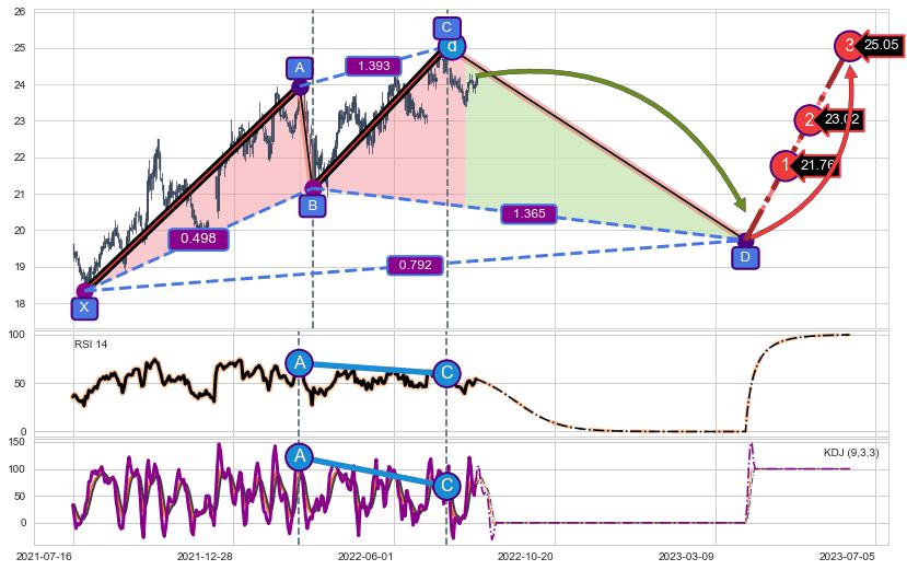 ➣ D点拟合预测价格19.73,距离最后交易收盘价格24.23相差 -18.59%