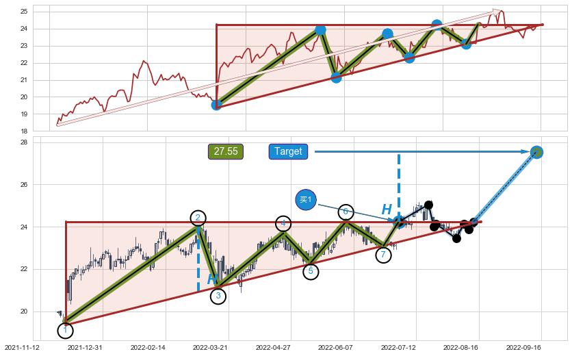 ➢ 【空方力量耗尽,多方打破攻守平衡点】上升三角形中继整理, 已在2022-07-01突破【阻力】颈线 24.23 →演变成上升通道