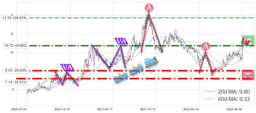 ♘ 阻力价格位10.72,可信任强度75.59%,距离最后交易2022-08-12形成的收盘价格10.62相差 +0.94%