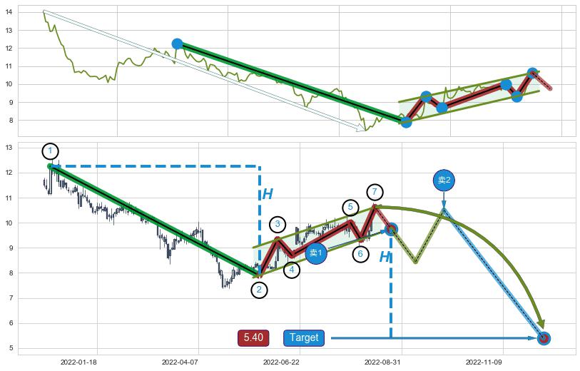 ➢ 低点影线(2022-06-23: 9.03 )→回踩→第二根k线低点(2022-06-20: 9.16 )