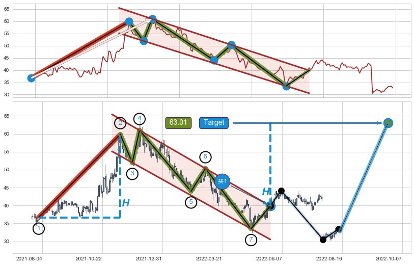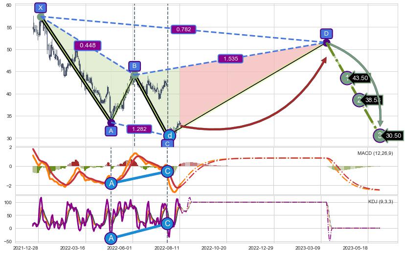 ➣ D点拟合预测价格51.53,距离最后交易收盘价格32.68相差 +57.67%
