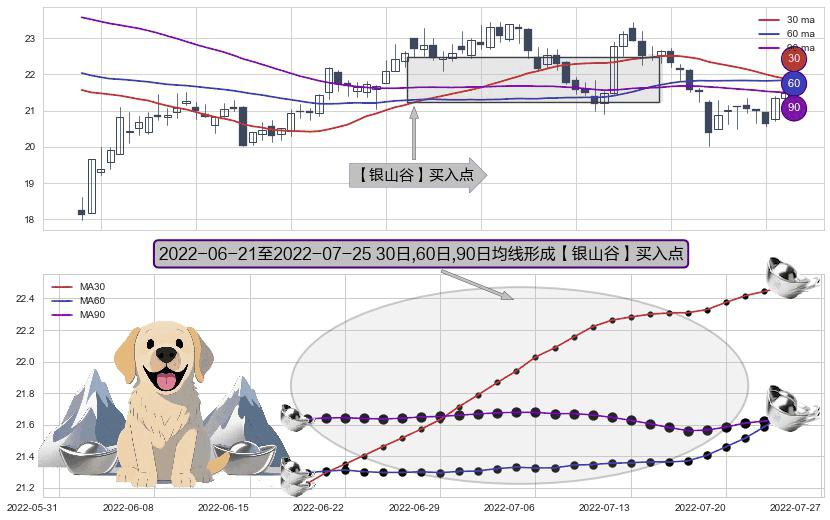 形态多维评估: ⚀ 2022-06-22-日至2022-07-25-日显现 30日-60日-90日均线 【银山谷】买入点 看多信号,后市看涨,买入