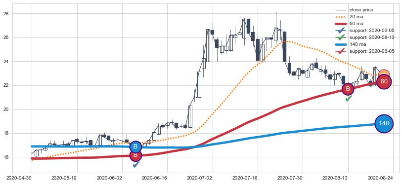 上涨趋势2020-04-30-2020-08-24,均线140, 60确认关键支撑2处