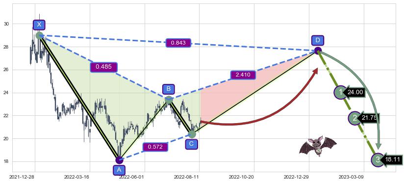 ➣ 未完成【蝙蝠】形态起点X: 2022-01-04, 已到达C点: 2022-08-02, 预测最终D点: 2023-01-10, 共255交易日