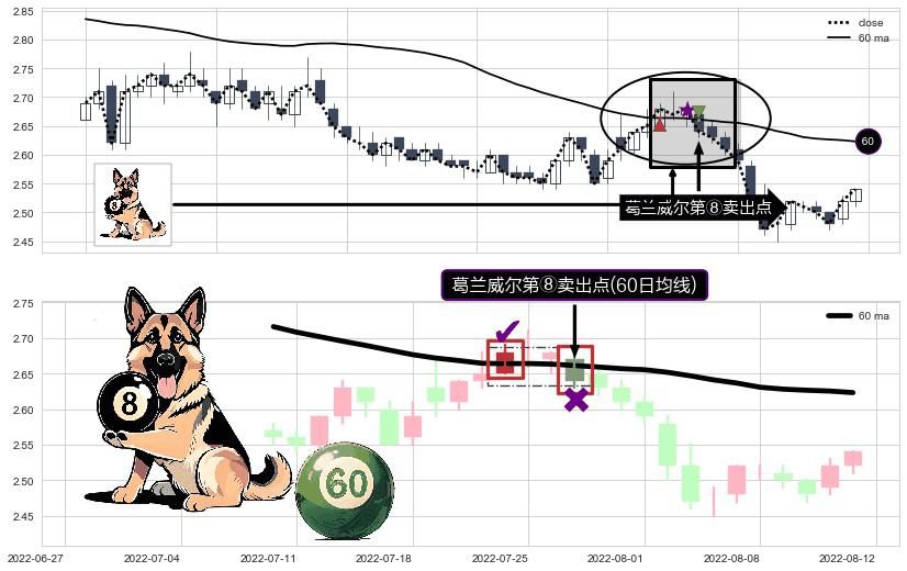 ⚁ 60日均线 第⑧卖出点 属于 均线服从 信号,属于趋势运行的【常态】即信号期望为下降趋势的中继