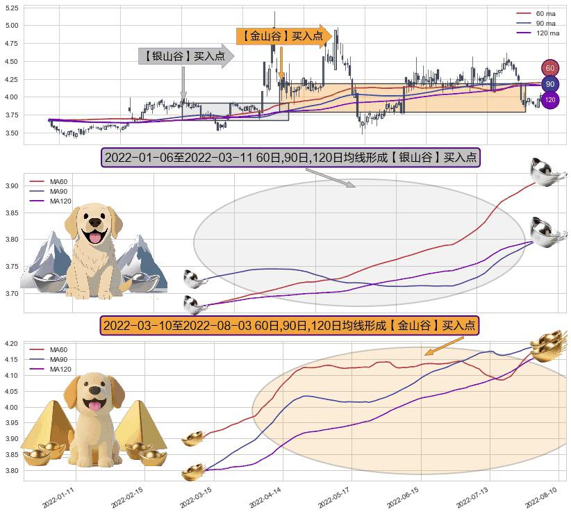 ⚀ 2022-03-11-日至2022-08-03-日显现 60日-90日-120日均线 【金山谷】买入点 其再次确认了买入信号,可靠性更强,买入