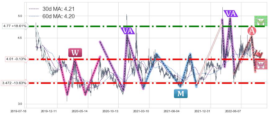 ♘ 支撑价格位4.01,可信任强度86.19%,距离最后交易2022-08-12形成的收盘价格4.02相差 -0.13%