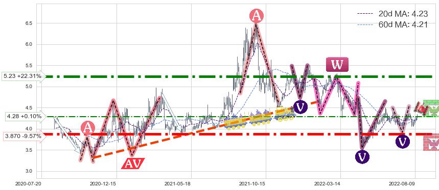 ♘ 阻力价格位4.28,可信任强度54.82%,距离最后交易2022-08-12形成的收盘价格4.28相差 +0.10%
