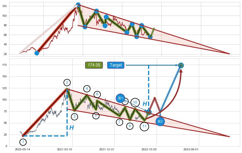 ➢ 最小中继整理涨幅→𝐇: 100.73 (𝐇楔型旗杆的长度:楔型起点→顶点)