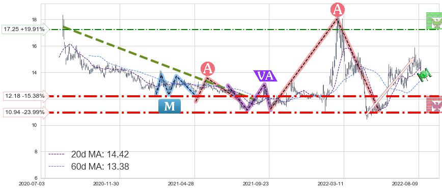 ♘ 阻力价格位17.25,可信任强度54.87%,距离最后交易2022-08-12形成的收盘价格14.39相差 +19.91%