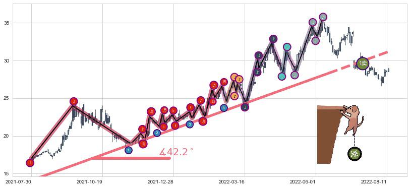 ✂️ 2021-07-30-2022-06-15上升趋势存在反转[风险],其原上升趋势的支撑位(31.17)已破位[强阻力信号],原上升趋势角度: 42.2˚