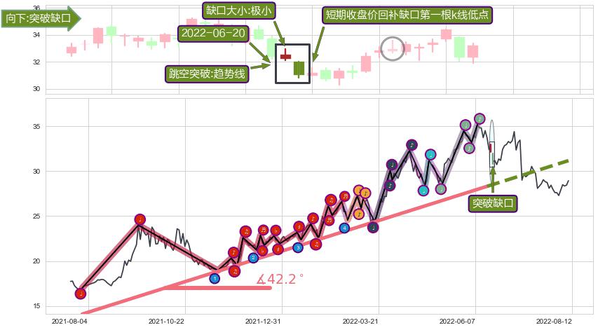➢ 2021-07-30-2022-06-15上升趋势存在反转[风险],其原上升趋势的支撑位(31.17)已破位[强阻力信号],原上升趋势角度: 42.2˚