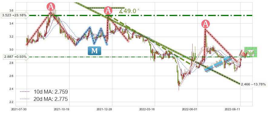 ♘ 阻力价格位3.523,可信任强度75.07%,距离最后交易2022-08-12形成的收盘价格2.860相差 +23.18%