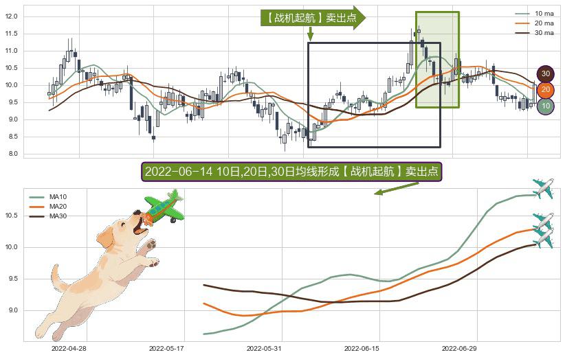 形态多维评估: ⚀ 2022-05-19日-2022-07-07日显现 10日-20日-30日均线 【战机起航】卖出点 看空信号,后市看跌,卖出
