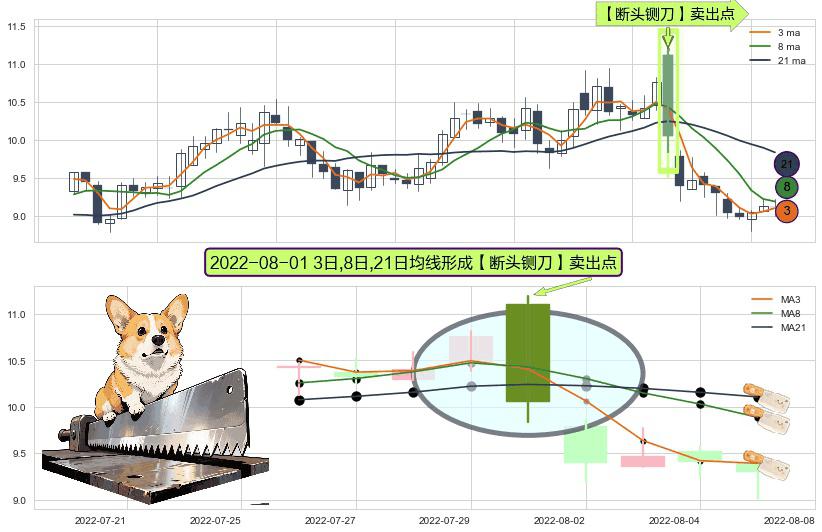 ⚀ 2022-08-01日显现 3日-8日-21日均线 【断头铡刀】卖出点 看空信号,后市看跌,卖出