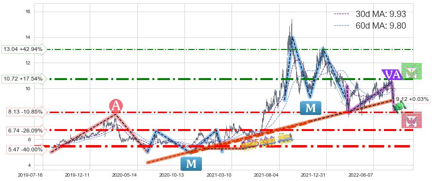 ♘ 支撑价格位5.47,可信任强度97.36%,距离最后交易2022-08-12形成的收盘价格9.12相差 -40.00%