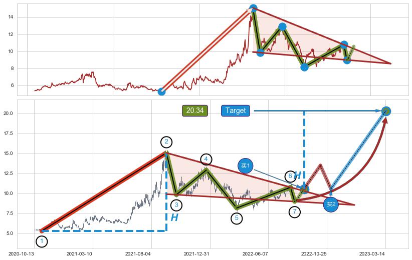 ➢ 最小中继整理涨幅→𝐇: 9.78 (𝐇楔型旗杆的长度:楔型起点→顶点)