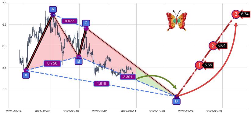 ➣ 未完成【蝴蝶】形态起点X: 2021-10-28, 已到达C点: 2022-04-01, 预测最终D点: 2022-11-17, 共262交易日