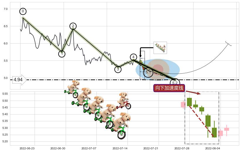 2022-06-22: 时域附近第一阻力位5.45持续的对下跌趋势进行阻拦,有效地放缓了下跌的速度。