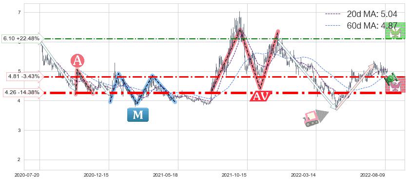 ♘ 支撑价格位4.26,可信任强度91.38%,距离最后交易2022-08-12形成的收盘价格4.98相差 -14.38%