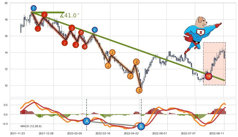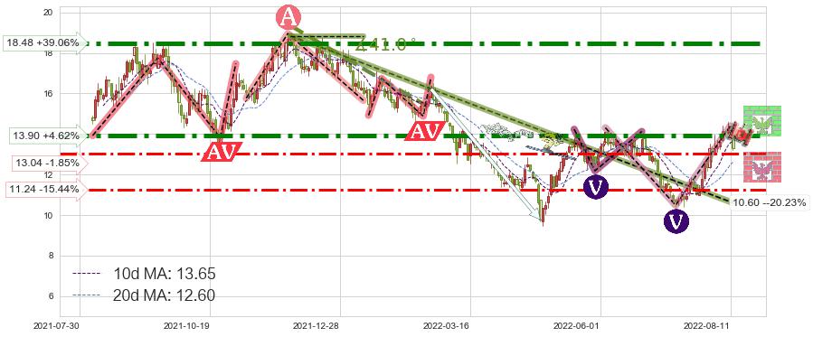 ♘ 阻力价格位13.90,可信任强度92.41%,距离最后交易2022-08-12形成的收盘价格13.29相差 +4.62%