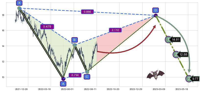 ➣ 未完成【蝙蝠】形态起点X: 2021-12-01, 已到达C点: 2022-07-13, 预测最终D点: 2023-02-08, 共298交易日