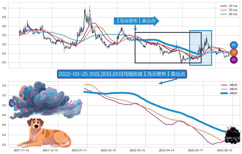 ⚀ 2022-01-07日-2022-06-13日显现 20日-30日-60日均线 【乌云密布】卖出点 看空信号,后市看跌,卖出