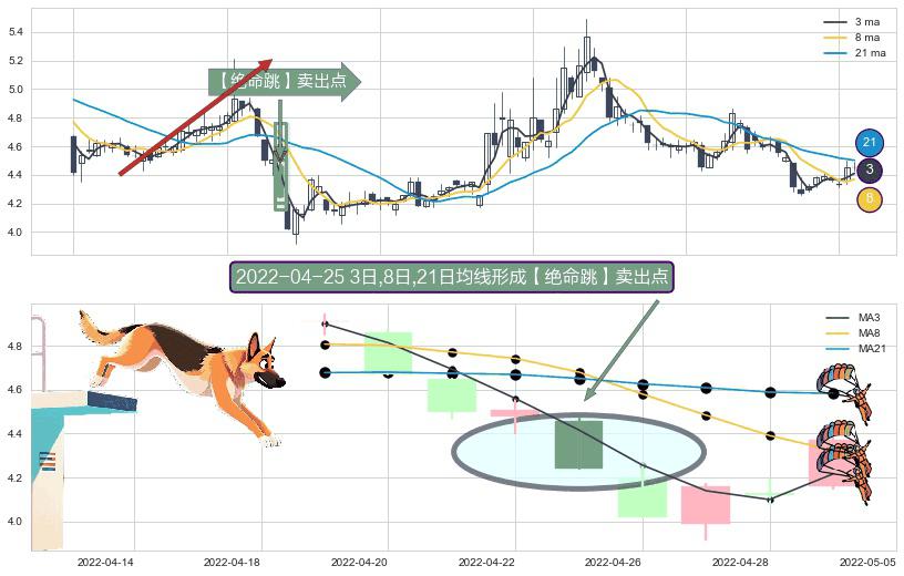 ⚀ 2022-04-25日显现 3日-8日-21日均线 【绝命跳】卖出点 看空信号,后市看跌,卖出
