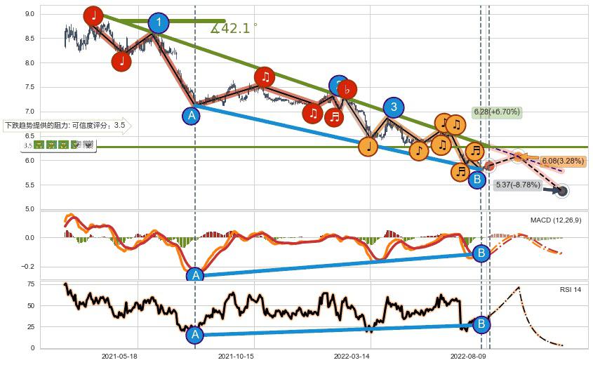 ♘ 阻力价格位6.34,可信任强度53.86%,距离最后交易2022-08-12形成的收盘价格5.89相差 +7.57%