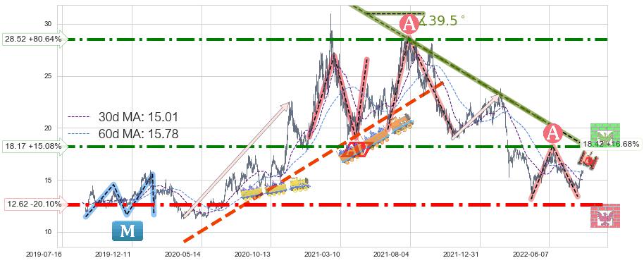 ♘ 阻力价格位18.17,可信任强度84.22%,距离最后交易2022-08-12形成的收盘价格15.79相差 +15.08%