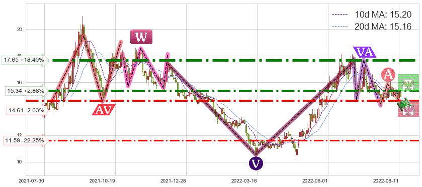 ♘ 阻力价格位15.34,可信任强度76.53%,距离最后交易2022-08-12形成的收盘价格14.91相差 +2.88%
