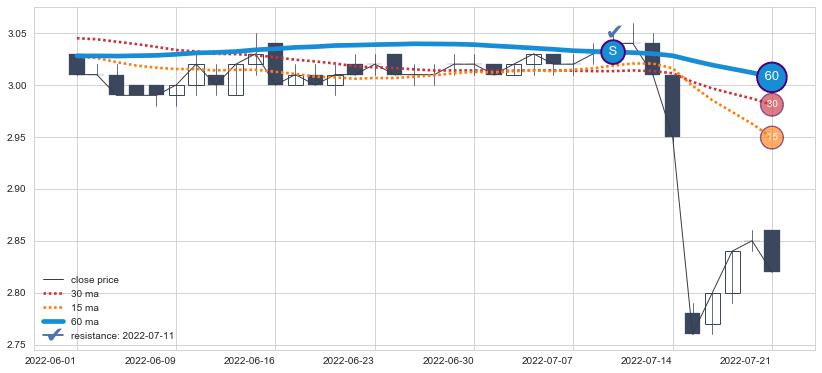 下跌趋势2022-06-01-2022-07-21,均线60确认关键阻力1处