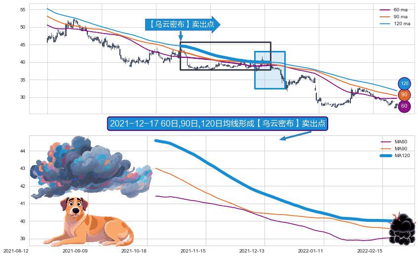 形态多维评估: ⚀ 2021-10-21日-2022-02-22日显现 60日-90日-120日均线 【乌云密布】卖出点 看空信号,后市看跌,卖出
