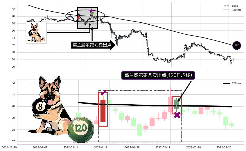 形态多维评估: ⚀ 2022-02-14-日显现 葛兰威尔均线 120日均线 第⑧卖出点 下降趋势的中继信号,后市看跌,卖出信号