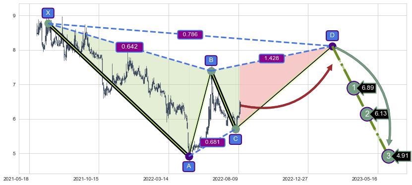 ➣ D点拟合预测价格8.11,距离最后交易收盘价格6.39相差 +26.96%