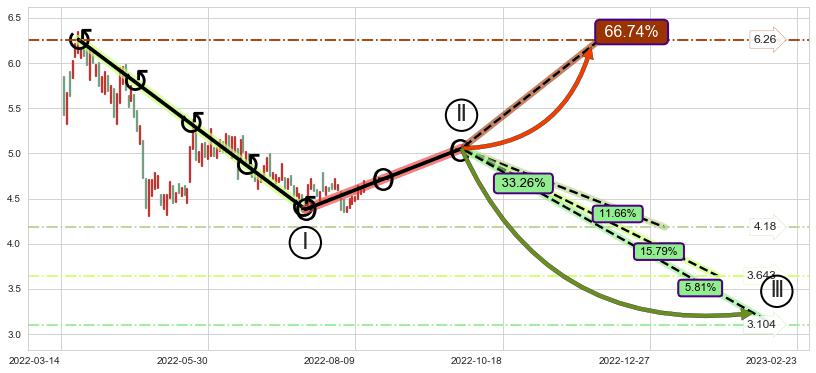 ➣ 循环浪继续向下【平均值】位置(2023-01-27, 3.643),匹配聚类样本比例47.48%, 可能性概率15.79%