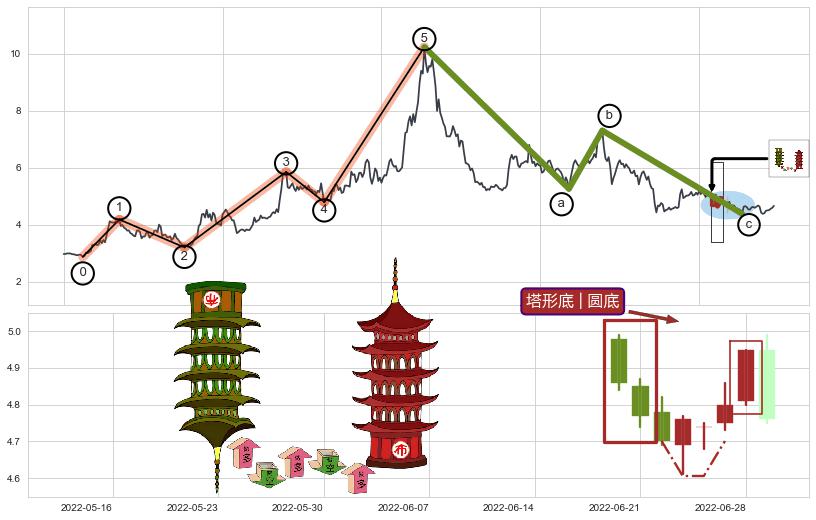 | 22 🅚:塔形底 | 圆底 ➕ 🌊:波浪理论猜想下跌浪5已形成,猜想后续形成abc反弹上涨(均值回复) ☞ 看多信号 ⇥ 【🅚线】交织【图形】⇥ 综合量化分数: 51 | > |