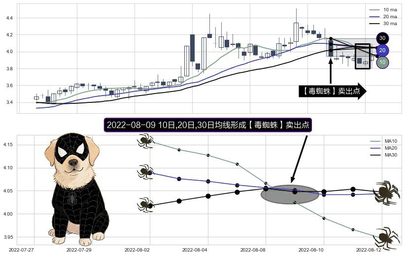形态多维评估: ⚀ 2022-08-09日显现 10日-20日-30日均线 【毒蜘蛛】卖出点 看空信号,后市看跌,卖出