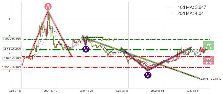 ♘ 阻力价格位4.22,可信任强度88.07%,距离最后交易2022-08-12形成的收盘价格3.970相差 +6.40%