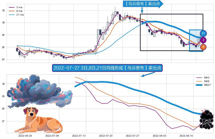 ⚀ 2022-07-11日-2022-08-12日显现 3日-8日-21日均线 【乌云密布】卖出点 看空信号,后市看跌,卖出
