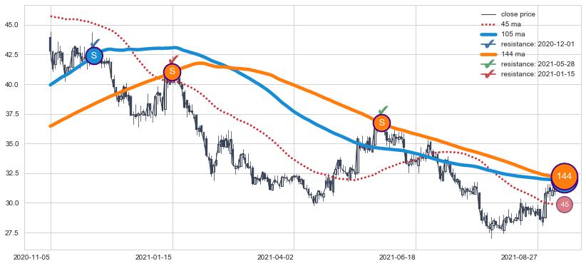⚁ MA3和MA8走势平行,且始终保持在短距离内,MA21始终在短中期均线上方,与短中期均线保持一定的距离,微微下行