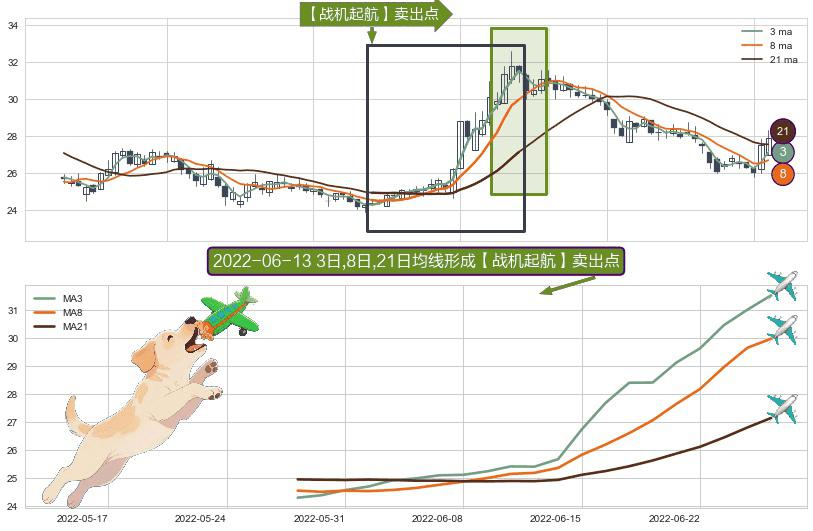 ⚀ 2022-05-27日-2022-06-27日显现 3日-8日-21日均线 【战机起航】卖出点 看空信号,后市看跌,卖出