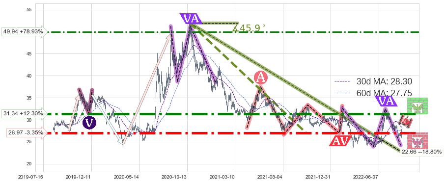 ♘ 支撑价格位26.97,可信任强度88.91%,距离最后交易2022-08-12形成的收盘价格27.91相差 -3.35%
