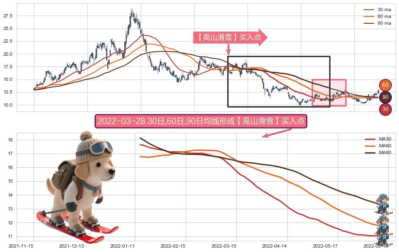 ⚀ 2022-01-13日-2022-06-09日显现 30日-60日-90日均线 【高山滑雪】买入点 看多信号,后市看涨,买入