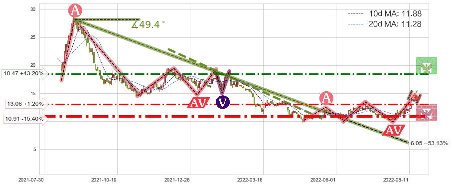 ♘ 支撑价格位10.91,可信任强度94.22%,距离最后交易2022-08-12形成的收盘价格12.90相差 -15.40%