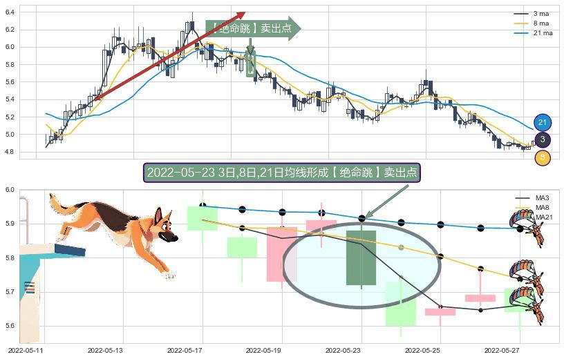 形态多维评估: ⚀ 2022-05-23日显现 3日-8日-21日均线 【绝命跳】卖出点 看空信号,后市看跌,卖出