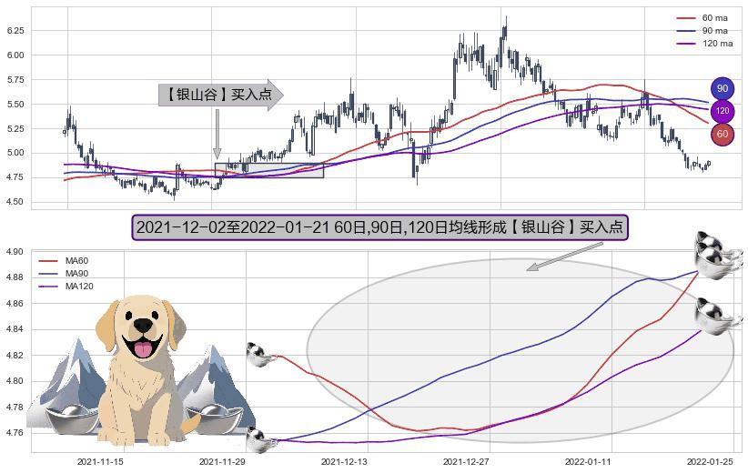 形态多维评估: ⚀ 2021-12-03-日至2022-01-21-日显现 60日-90日-120日均线 【银山谷】买入点 看多信号,后市看涨,买入